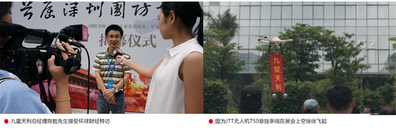 深圳市特種產業協會秘書長趙熙在采訪中表示,今年是中國人民抗日戰爭暨世界反法西斯戰爭勝利70周年。為了紀念70年前那場艱苦卓絕的民族抗戰,銘記歷史、緬懷先烈、珍愛和平、開創未來,深圳市特種產業協會在深圳市國防科技工業辦公室、南山區政府的悉心指導以及社會各界的關懷下,組織深圳軍工相關企業,隆重舉辦“首屆深圳國防書畫展”。深圳九星天利科技有限公司作為軍工企業的無人機科技行業的佼佼者,也被邀請為此次展會的特約嘉賓。