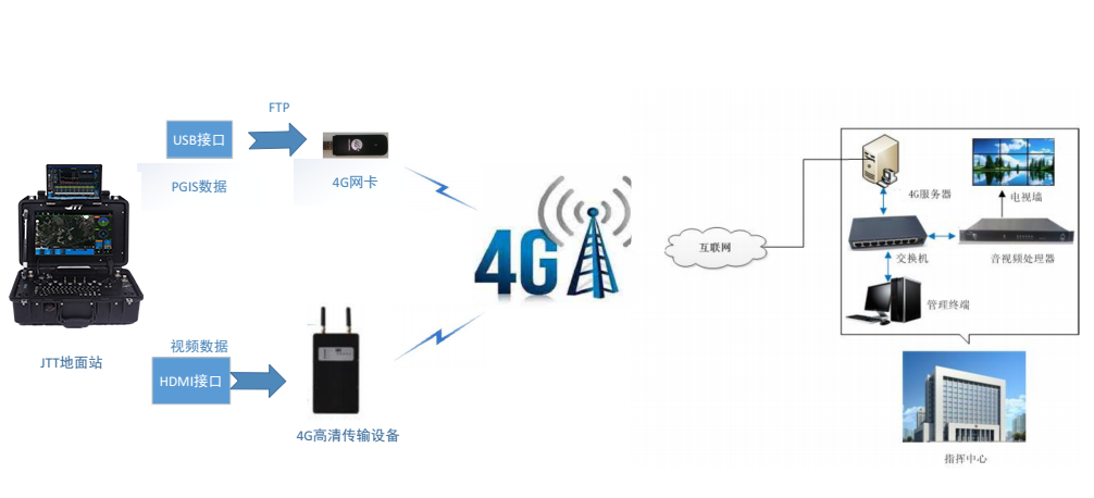 無(wú)人機(jī)在巡檢時(shí)高空拍攝到的圖像和視頻以及無(wú)人機(jī)的坐標(biāo)、高程信息通過(guò)無(wú)線通信鏈路傳輸?shù)降孛嬲竞螅赏ㄟ^(guò)專用有線網(wǎng)絡(luò)與現(xiàn)場(chǎng)的移動(dòng)前置機(jī)形成數(shù)據(jù)通路,也可借助4G網(wǎng)絡(luò)把數(shù)據(jù)輸入到內(nèi)網(wǎng)的數(shù)據(jù)庫(kù)中并連通到應(yīng)急指揮調(diào)度平臺(tái)。通過(guò)這種方式,巡檢現(xiàn)場(chǎng)的第一手資料與龐大的數(shù)據(jù)庫(kù)之間就形成了協(xié)同作戰(zhàn)的態(tài)勢(shì)。無(wú)論是領(lǐng)導(dǎo)指揮還是第一線巡檢人員的具體執(zhí)行都將得到有力、有效和迅速的信息支撐。