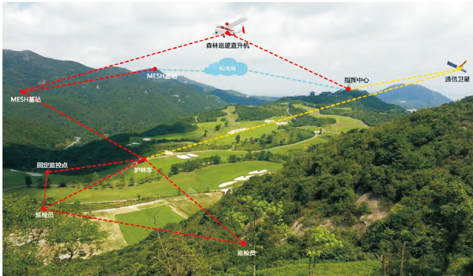 森林防火應急救援通信系統,利?先進的MESH?組?設備,將適量的遠距離MESH基站安裝在瞭望塔上,配合護林?載MESH、森林巡邏直升機機載MESH、護林巡檢員單兵MESH等,建??張森林防?專??線傳輸監控?,將林區實視頻數據,環境數據等傳給林區調度指揮中?,形成對整個林區的實時監測監控,做到提前預測,提前防范,提前?動。