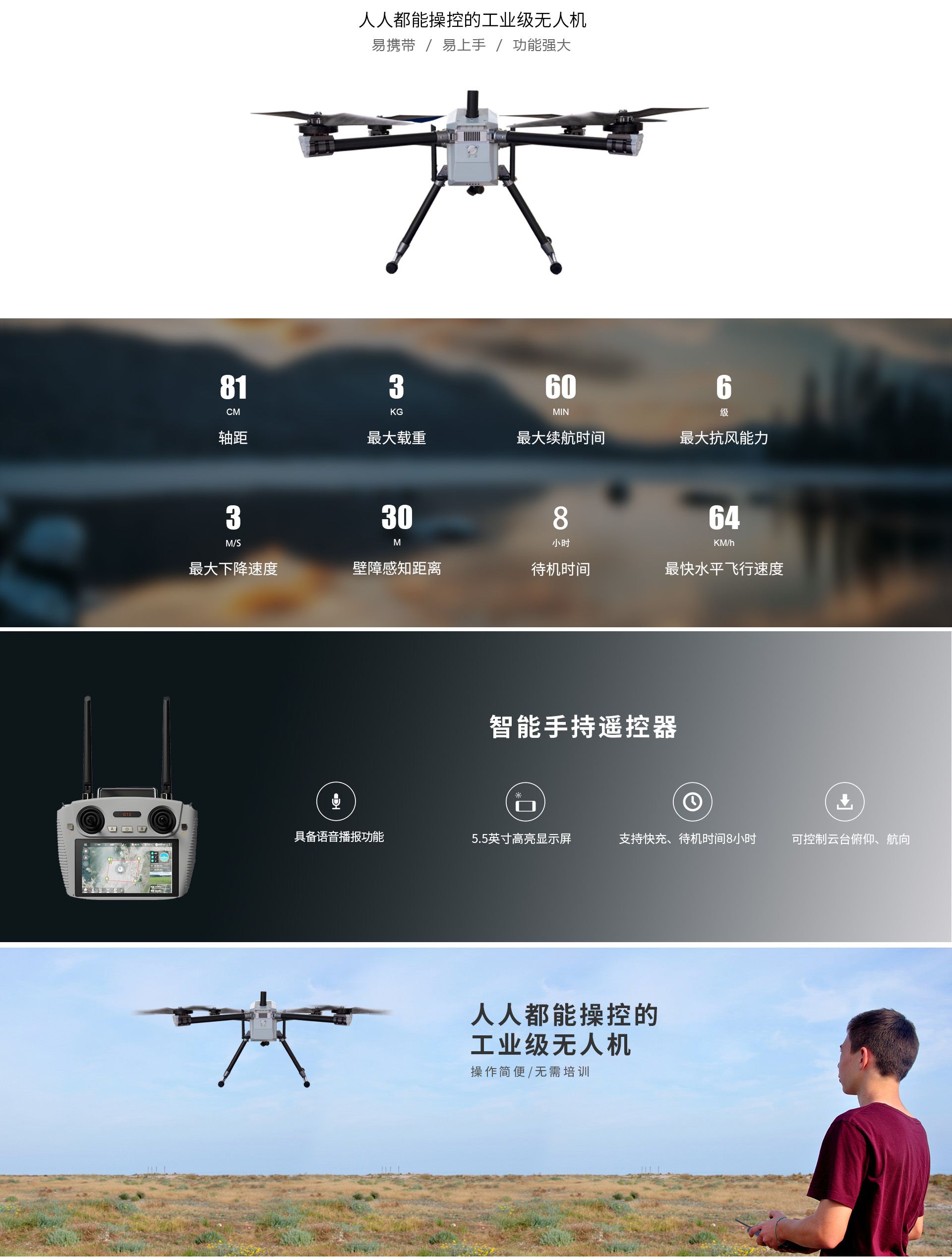 四旋翼無人機,載重3KG;