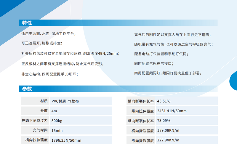 用于水域中快速通行,靜態下承載浮力500kg;可折疊,材質為橡膠涂覆織物