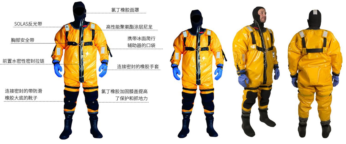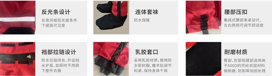 采用320D加粗3層防水透氣復合尼龍布,層壓復合面料技術,面料具有超輕、耐磨、抗切割、防水、透氣等功能,可安全可靠的應用于寒冷水域救援工作。